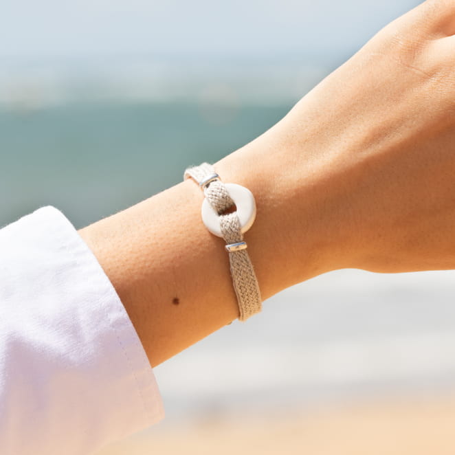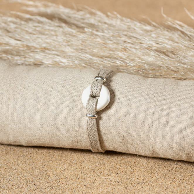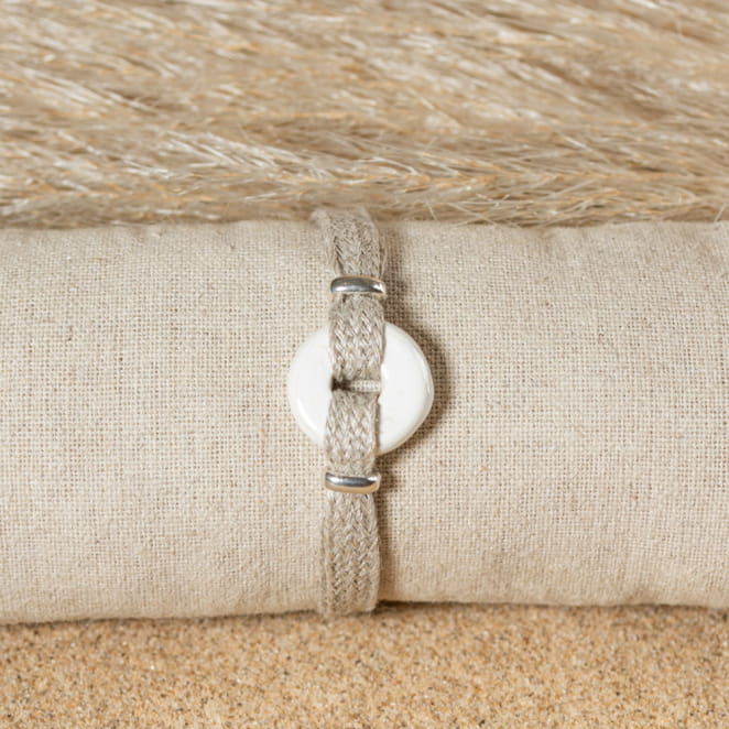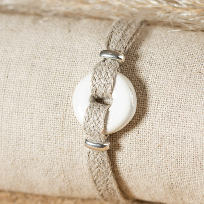 Découvrez le bracelet pour femme Dana, un accessoire élégant et naturel. Composé d'un cordon en lin durable, il est orné en son centre d'un pendentif donut en céramique blanche. Ce bijou unique allie simplicité et charme artisanal, parfait pour ajouter une touche subtile de sophistication à votre style quotidien.
