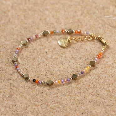Découvrez le bracelet de cheville Baia, un bijou fantaisie alliant chaîne dorée et perles multicolores. voir plus