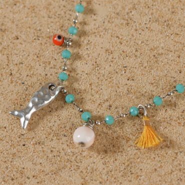 - d'une chaîne avec des perles en métal plaqué argent 999 et des perles bleues,