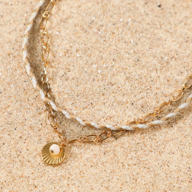 Direction les beaux jours avec le bracelet de cheville artisanal doré et blanc Zanzibar, agrémenté d'un charmant pendentif en coquillage doré. voir plus