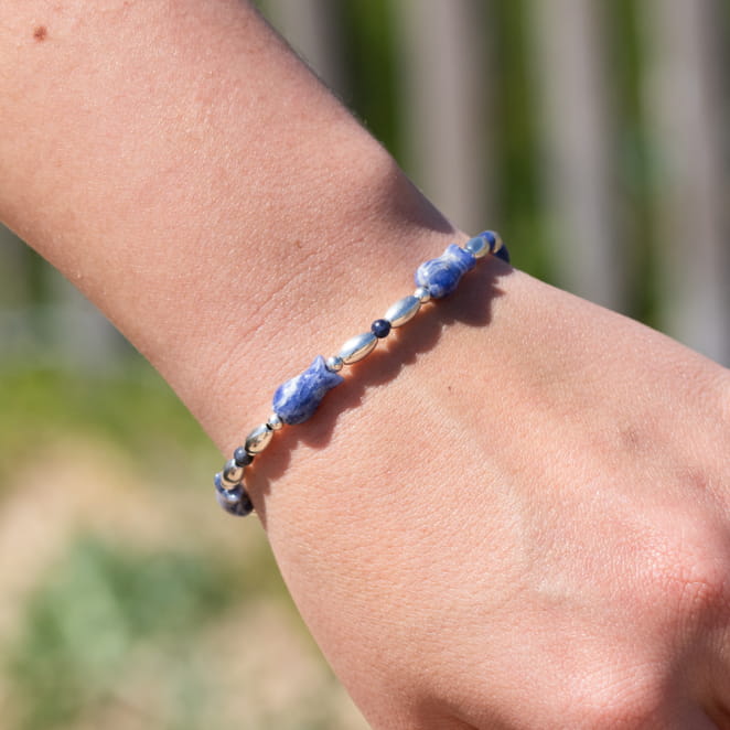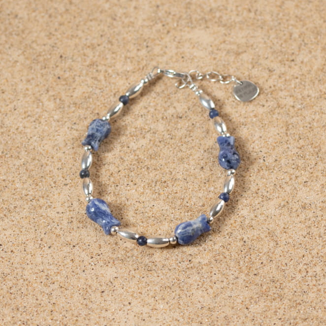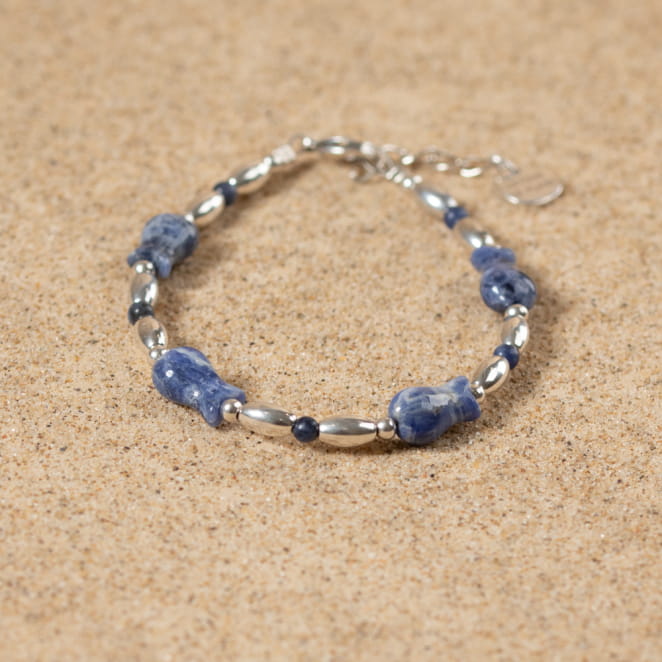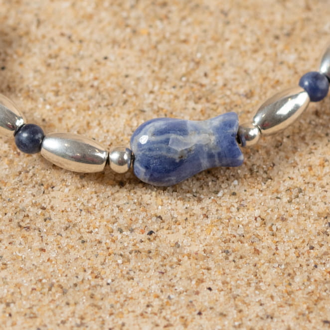 Plongez dans l'ambiance estivale avec le bracelet Dérive. Composé de perles ovales et rondes argentées, ainsi que de perles en forme de poissons bleu marine marbré, ce bijou évoque les souvenirs de vacances au bord de la mer. Alliant élégance et originalité, le bracelet Dérive est un accessoire parfait pour ajouter une touche marine à votre style.