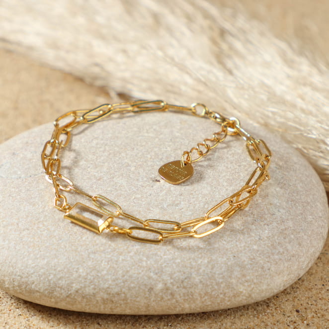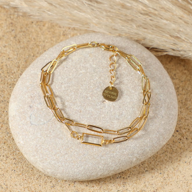 Optez pour notre lumineux bracelet en chaîne Diaba, un bijou élégant qui ajoute une touche de lumière à toutes vos tenues. La double chaîne dorée apporte à ce bijou avec simplicité : raffinement et délicatesse au poignet. Le rectangle transparent ajoute délicatesse au bijou, le doré évoque l'éclat des plages de la côte Ouest. Diaba est le bracelet chaîne pour femme idéal pour briller en toute occasion.
