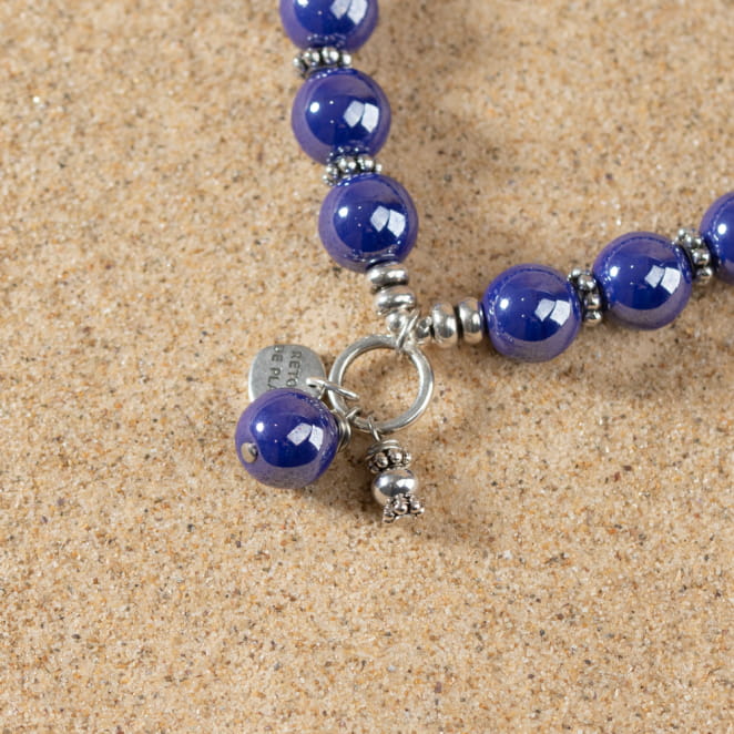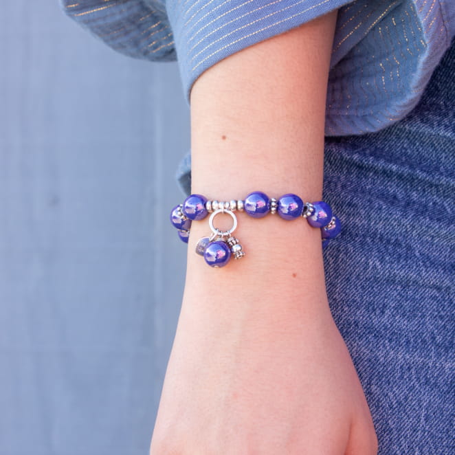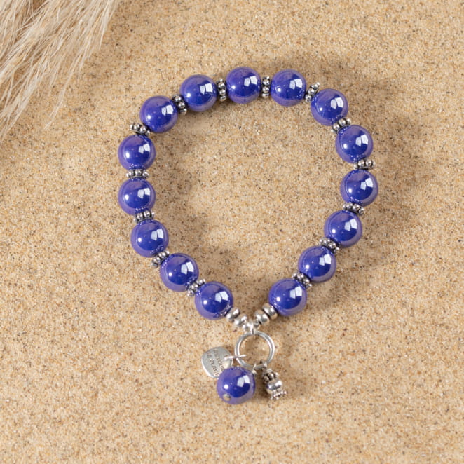 Le bracelet Doly est un bijou délicat qui ne passe pas inaperçu. Ses perles en verre bleu dur éclatantes sont mises en valeur par un métal argenté raffiné. Ce bracelet attire instantanément les regards, ajoutant une touche d'élégance à votre poignet.