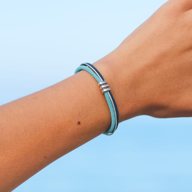 Le bracelet Duo fusionne habilement plusieurs brins aux tons bleu, vert et argenté, agrémentés de perles rectangulaires argenté. Cette composition audacieuse offre un équilibre parfait entre couleurs et textures. Avec son mélange unique de cordons et de perles, ce bijou apporte une touche de sophistication décontractée à toute tenue, ajoutant une élégance vibrante à votre style quotidien.