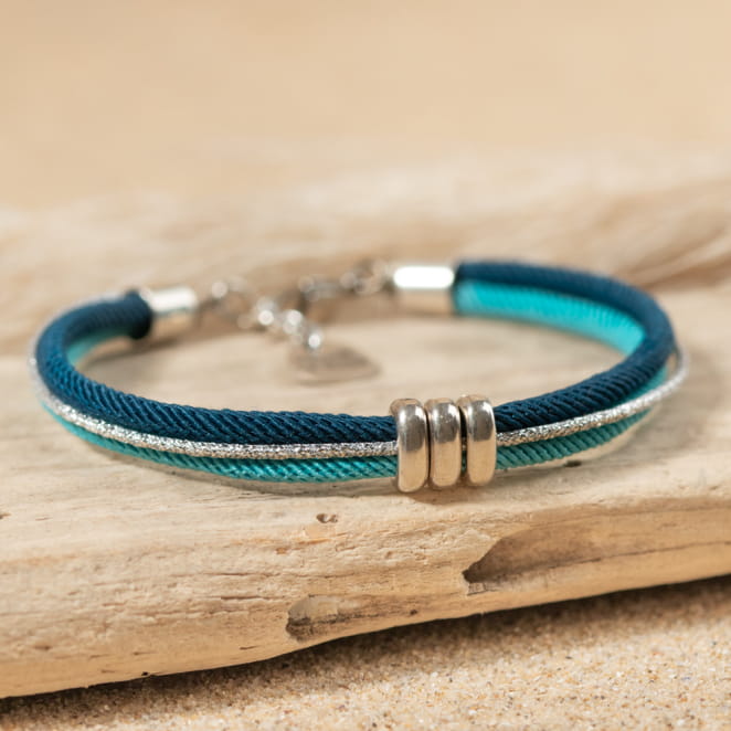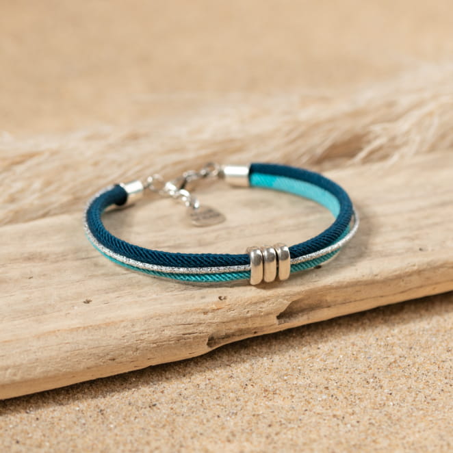Le bracelet Duo fusionne habilement plusieurs brins aux tons bleu, vert et argenté, agrémentés de perles rectangulaires argenté. voir plus