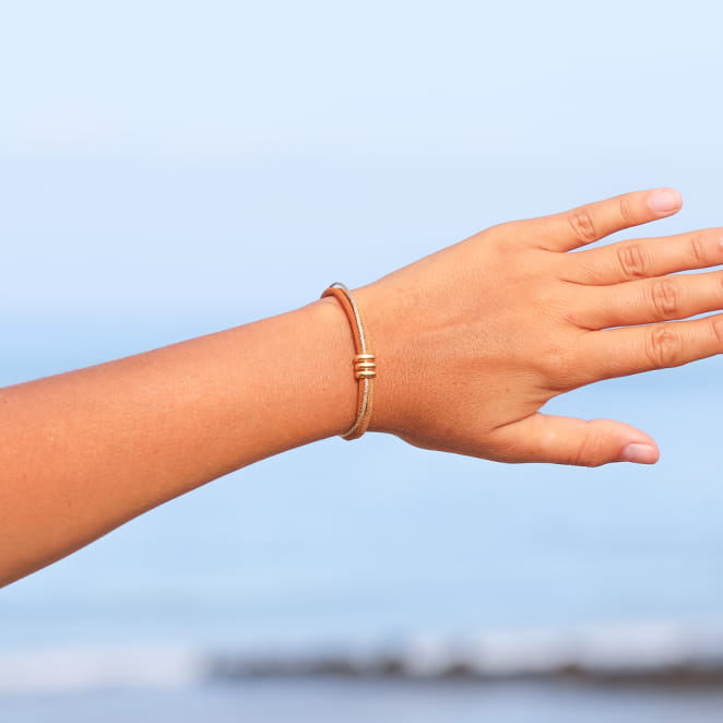 Le bracelet Duo fusionne habilement plusieurs brins aux tons marron, jaune et doré, agrémentés de perles rectangulaires dorées. Cette composition audacieuse offre un équilibre parfait entre couleurs et textures. Avec son mélange unique de cordons et de perles, ce bijou apporte une touche de sophistication décontractée à toute tenue, ajoutant une élégance vibrante à votre style quotidien.