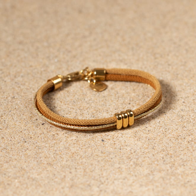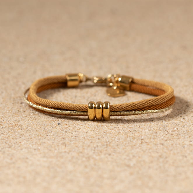 Le bracelet Duo fusionne habilement plusieurs brins aux tons marron, jaune et doré, agrémentés de perles rectangulaires dorées. voir plus