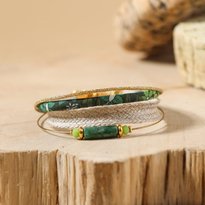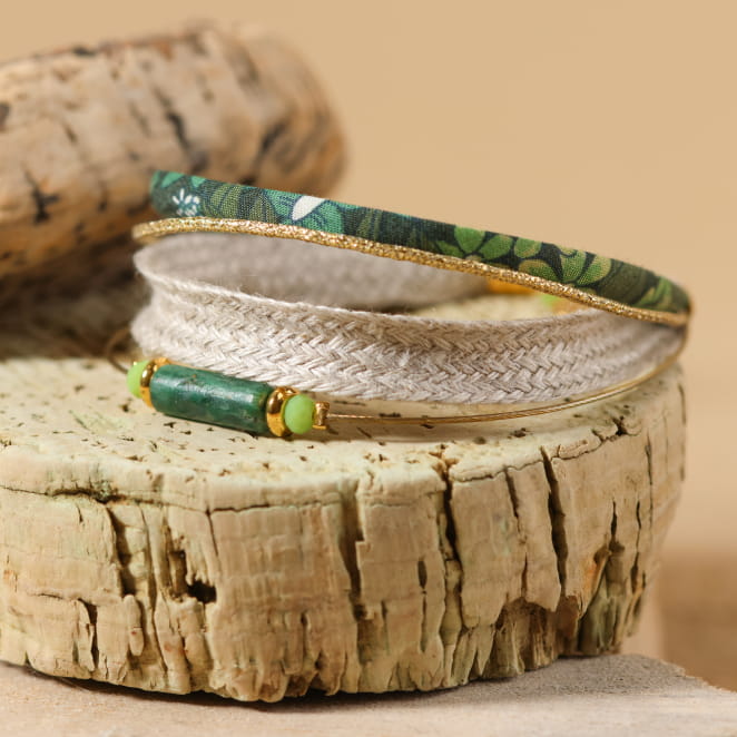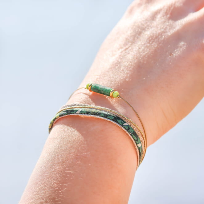 Succombez au charme du bracelet Elle, un bijou inspiré par la nature, les matières naturelles et l'élégance bohème. Ce bracelet femme évoque la douceur des paysages verdoyants, entre nuances végétales et textures naturelles. Son mélange subtil de matières, entre lin brut, tissu Liberty aux motifs floraux et jade vert intense, crée une harmonie parfaite entre raffinement et authenticité. Léger et facile à porter, ce bracelet illumine votre poignet tout en apportant une touche naturelle et tendance à vos tenues.