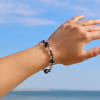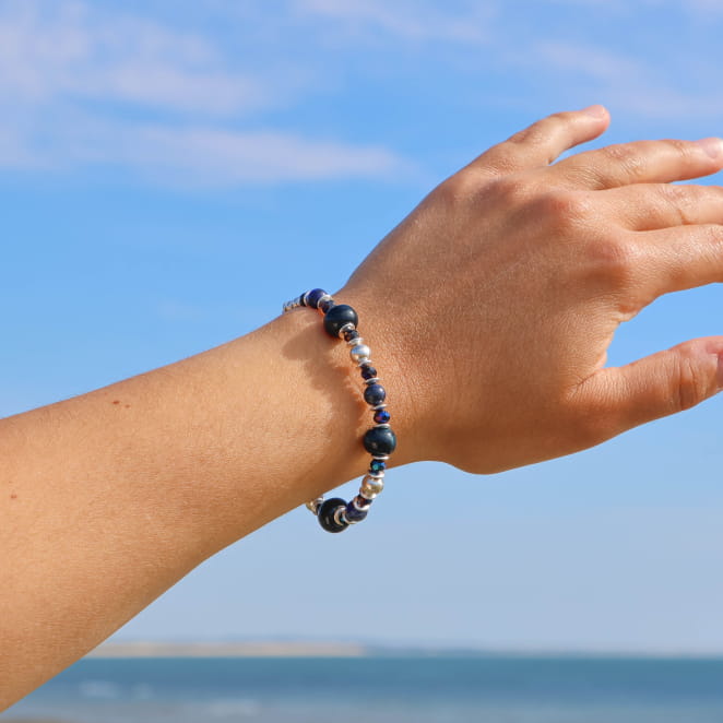 Adoptez l’esprit des océans avec le bracelet Elounda élastiqué en lapis-lazuli, verre et céramique. Inspiré par les nuances profondes et vibrantes des eaux marines, ce bijou est une célébration de la beauté naturelle et du raffinement artisanal. Parfait pour apporter une touche sophistiquée et décontractée à vos tenues, ce bracelet incarne une élégance intemporelle. Ce bracelet unique associe des perles en lapis-lazuli, avec leur bleu intense, à des perles en verre et en céramique finement travaillées. Les touches argentées viennent illuminer l’ensemble, rappelant le scintillement du soleil sur l’eau. Grâce à son fil élastique, il s’ajuste parfaitement à votre poignet, offrant confort et praticité ! Conçu et fabriqué à la main dans notre atelier sur l’île d’Oléron, ce bracelet reflète tout le savoir-faire de Retour de Plage. Chaque bijou est une pièce unique, pensée pour capturer l’essence de la côte Ouest et l’amour de la nature. Offrez à votre poignet un bijou qui évoque le voyage, la mer et l’horizon infini. Ce bracelet bleu est une invitation à rêver, à porter seul ou accompagné d’autres créations pour un look résolument marin et sophistiqué.