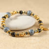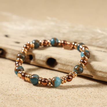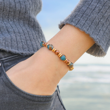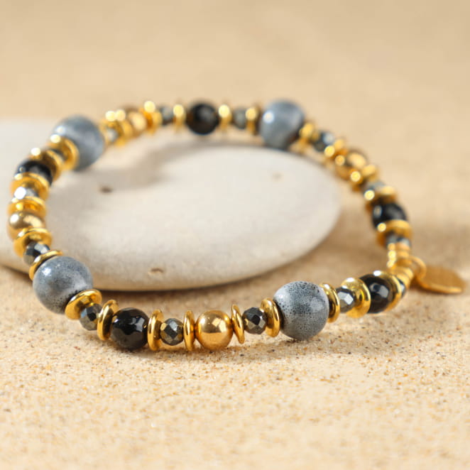 Adoptez le bracelet Elounda, une création unique. Confectionné à la main sur l’île d’Oléron, il marie l'hematite gris, verre et céramique, sublimés par des touches dorées inspirées des reflets du soleil. Grâce à son fil élastique, il s’ajuste parfaitement à votre poignet. Un bijou unique, symbole de voyage, de lumière et d’élégance naturelle, à porter seul ou en accumulation pour un style éclatant.