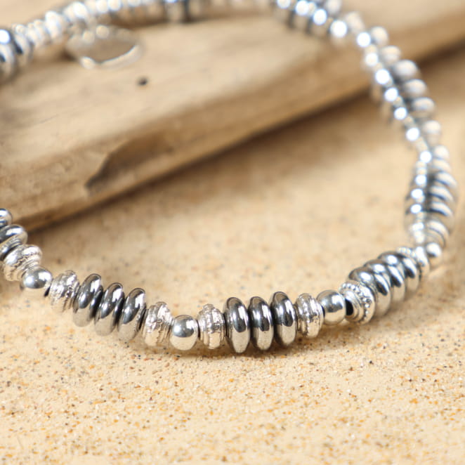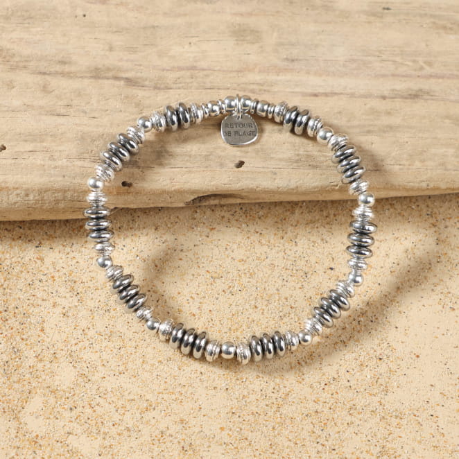 Découvrez une création artisanale où se mêlent douceur et authenticité, le bracelet Elowen. Ses perles en argent et en hématite, aux formes inspirées par les galets polis par la mer, s’enfilent avec légèreté. Un bijou fait main, comme un souvenir de balade sur le sable fin, à porter sans modération.