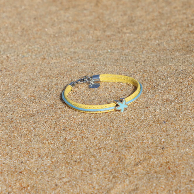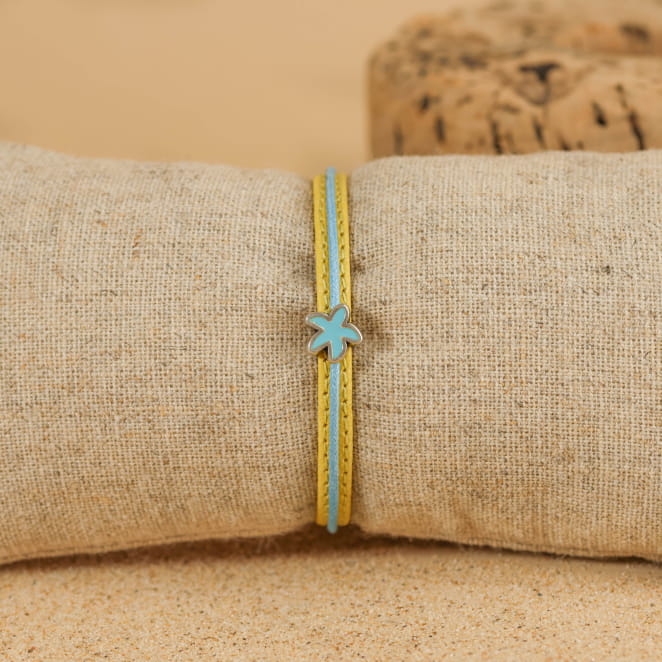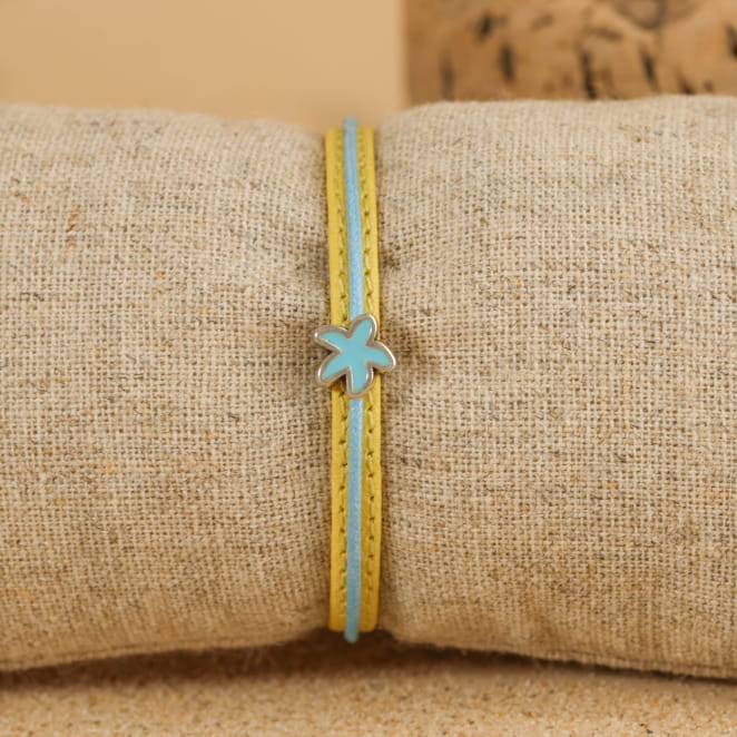 Notre bracelet pour enfant Imeo a été pensé pour accompagner les petits rêveurs d’océan. Son cordon en coton bleu s’allie à un ruban en cuir jaune pour un contraste joyeux et original. Tandis que le pendentif en forme d'étoile de mer bleue apporte une touche ludique et marine, parfaite pour un bijou enfant à la fois coloré, léger et facile à porter au quotidien !