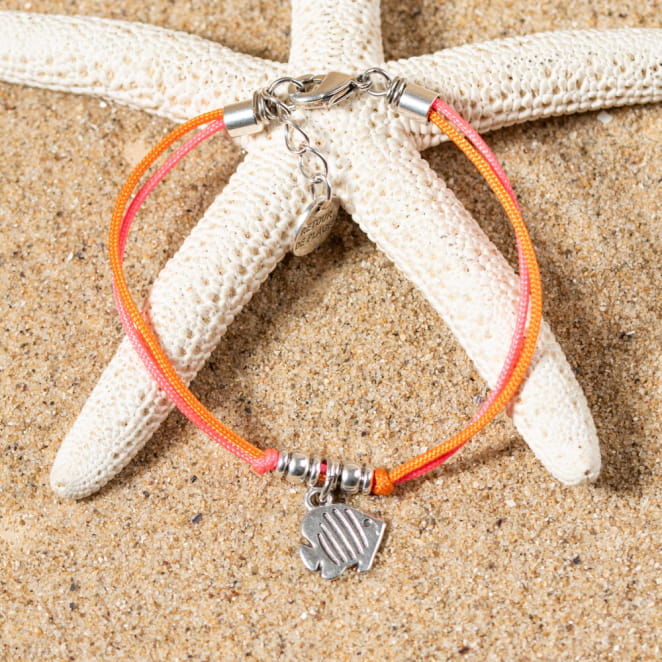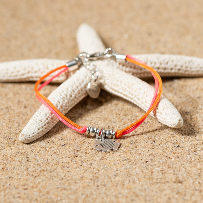 Embarquez dans une ambiance joyeuse avec le bracelet enfant Krusty : composé de cordons fluos orange et rose et agrémenté d'un pendentif argenté en forme de poisson, ce bracelet évoque la joie spontanée de l'enfance. voir plus