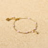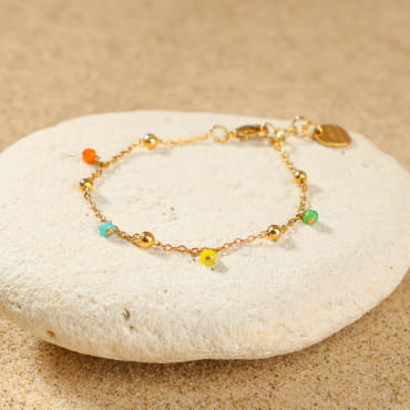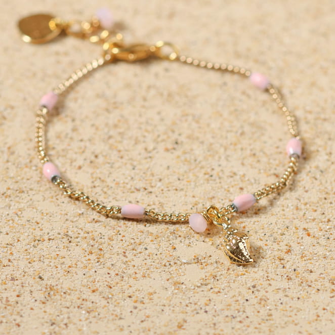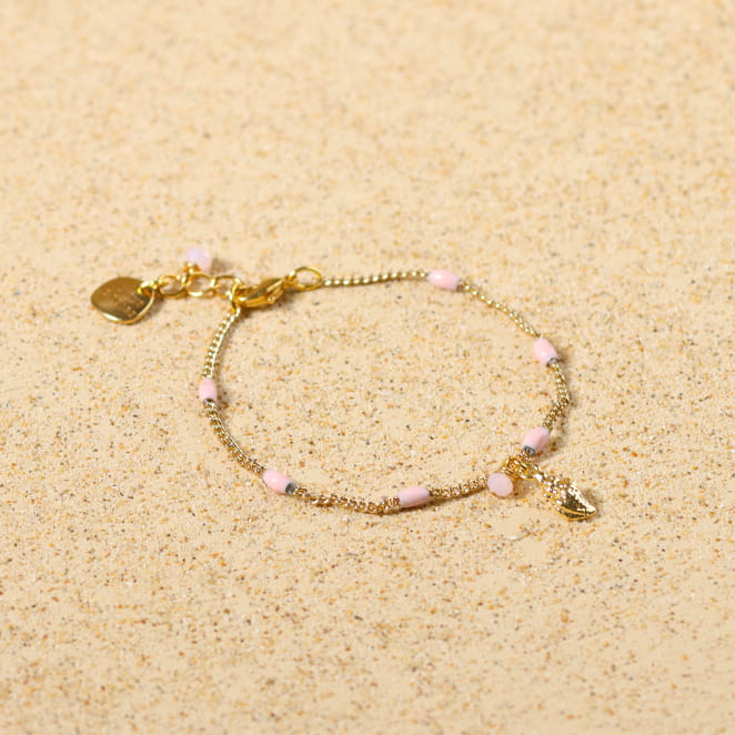 Découvrez notre barcelet pour enfant Lol : un délicat bracelet composé d'une chaîne dorée à l'or fin 24K et de petites perles roses pâles. Ce bijou pour enfant est idéal pour apporter de la couleur tout en restant discret. Son petit pendentif en forme de coquillage doré 24K et sa perle en verre rappellent les balades du bord de mer.