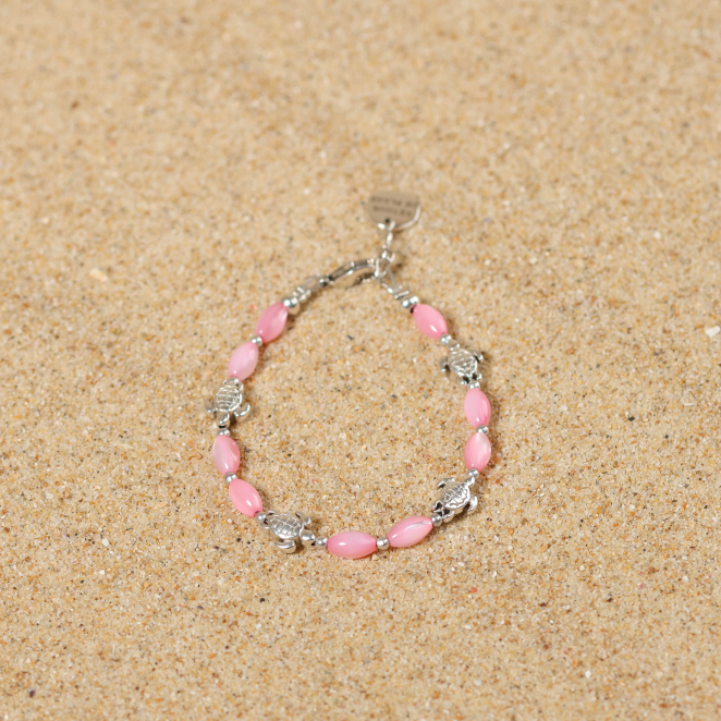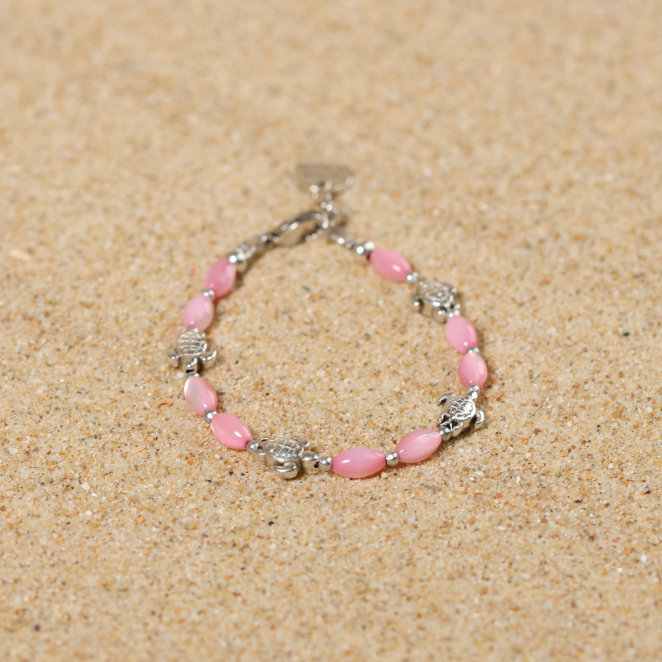 Ce bracelet coloré Mana est idéal pour le poignet d'un enfant. Il apportera de la gaieté avec ses perles en nacre rose et ses tortues argentées. Comme un arc en ciel, il apportera plein de joie et de bonheur à l'enfant qui le porte !