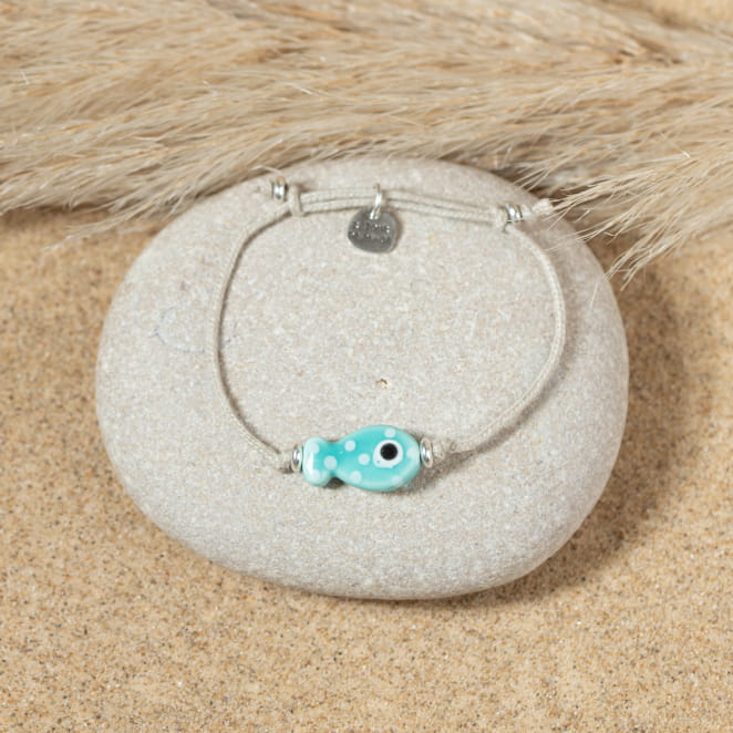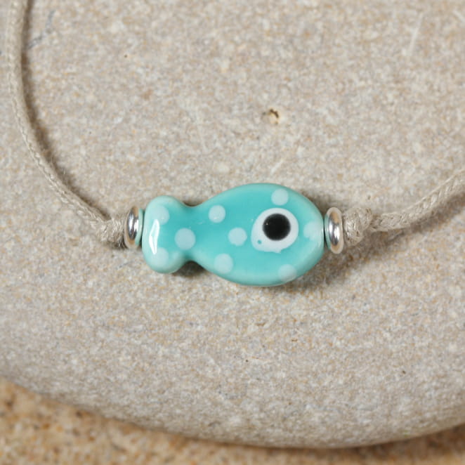 Plongez dans l'océan avec le bracelet enfant réglable Otto : composé d'un cordon en lin robuste et orné d'une perle en céramique en forme de poisson émeraude, ce bracelet évoque les journées ensoleillées à la plage. Réglable, il s'adapte à tous les poignets ! C'est le compagnon parfait pour une aventure estivale inoubliable.