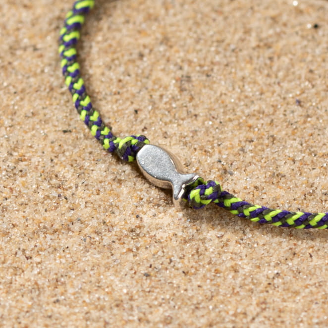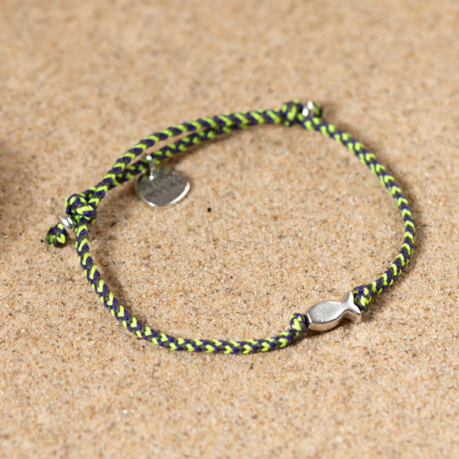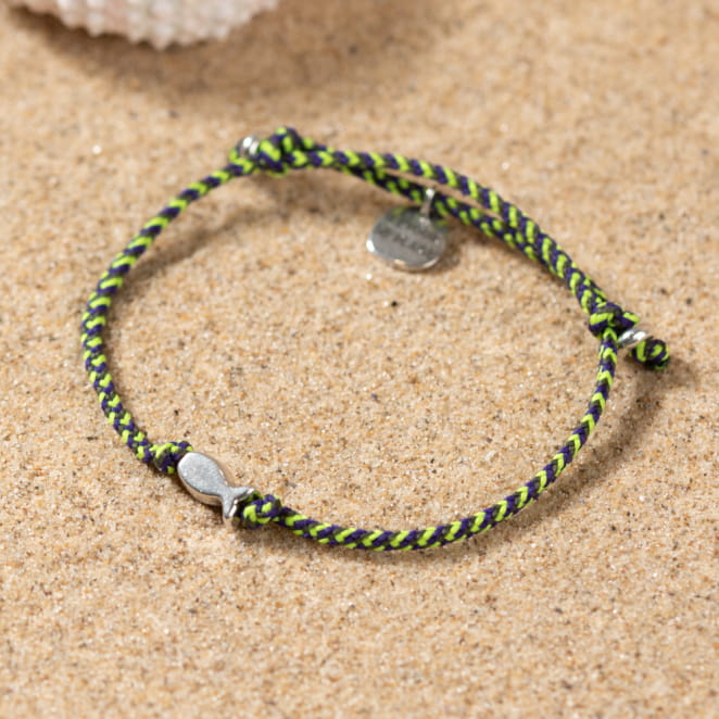 À la recherche d'un adorable accessoire pour enfant ? Découvrez le bracelet Pitchoune : un cordon tressé jaune multicolore agrémenté d'un petit poisson argenté. voir plus