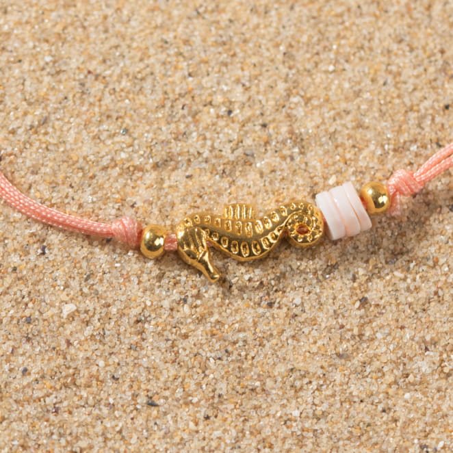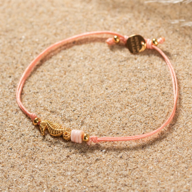 Plongez dans un monde de magie marine avec le bracelet Tétard. Spécialement conçu pour les enfants, ce bracelet enchanteur présente un cordon saumon orné d'un adorable pendentif hippocampe doré et de perles roses.