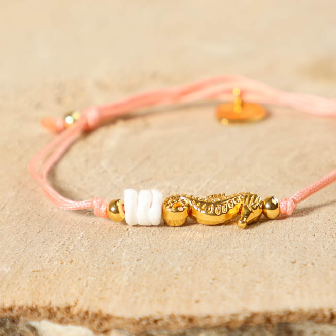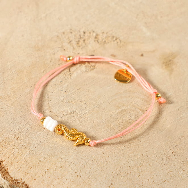 Plongez dans un monde de magie marine avec le bracelet Tétard. Spécialement conçu pour les enfants, ce bracelet enchanteur présente un cordon saumon orné d'un adorable pendentif hippocampe doré et de perles blanches.