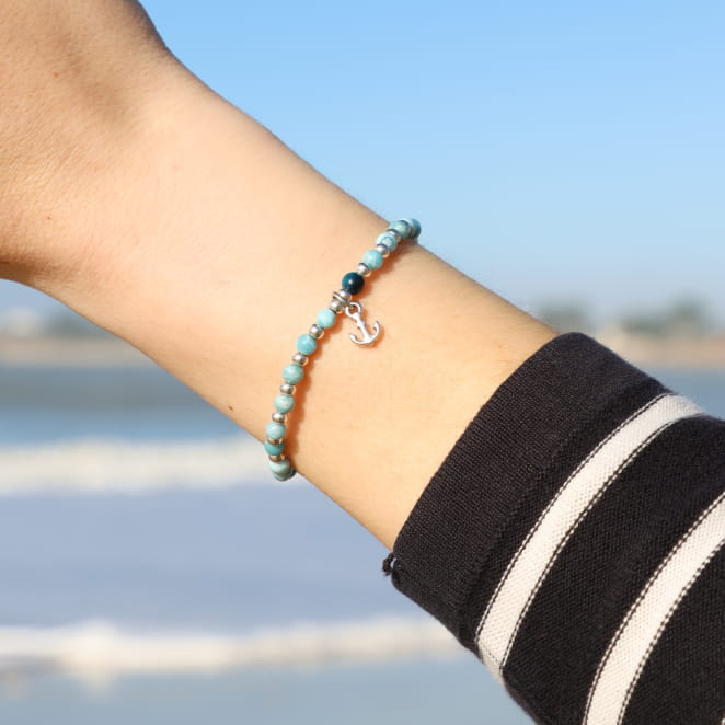 Plongez dans l’évasion avec le bracelet Erell, où le bleu du ciel rencontre la douceur argentée des vagues. Ce bijou, tel un fragment de l’horizon oléronais, il marie les perles de larimar aux reflets des perles en œil de tigre bleu. Le pendentif ancre donne éclat à votre poignet tout en délicatesse.