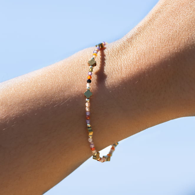 Découvrez le bracelet Evora, une délicate pièce en perles aux tons doux et multicolores, agrémentée de perles en nacre kaki. Évoquant la douceur de la nature, ce bracelet fin ajoute une touche de subtilité et d'élégance à votre poignet. Parfait pour apporter une note de couleur discrète à votre tenue, il incarne l'harmonie et la simplicité.