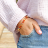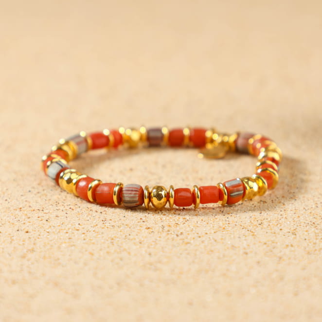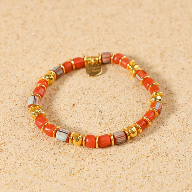 Laissez entrer la chaleur du soleil dans votre quotidien avec le bracelet Ezelia, une création éclatante et joyeuse qui évoque les lumières d’un coucher de soleil sur la plage. Composé de perles en verre aux nuances terracotta et orange, ponctué de perles dorées lumineuses, ce bracelet élastiqué allie éclat et confort. Son esprit solaire et ses couleurs chaleureuses en font un accessoire parfait pour apporter une touche de lumière à votre tenue. Ce bijou se porte aussi bien seul qu’en accumulation avec d’autres bracelets de la collection. Gai, chaleureux, lumineux – le Ezelia est une ode à la lumière dorée de la fin de journée !