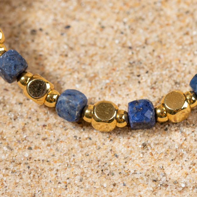 - de perles cubes en dumorterite bleu et en métal doré d'un flash d'or 24 carats,
