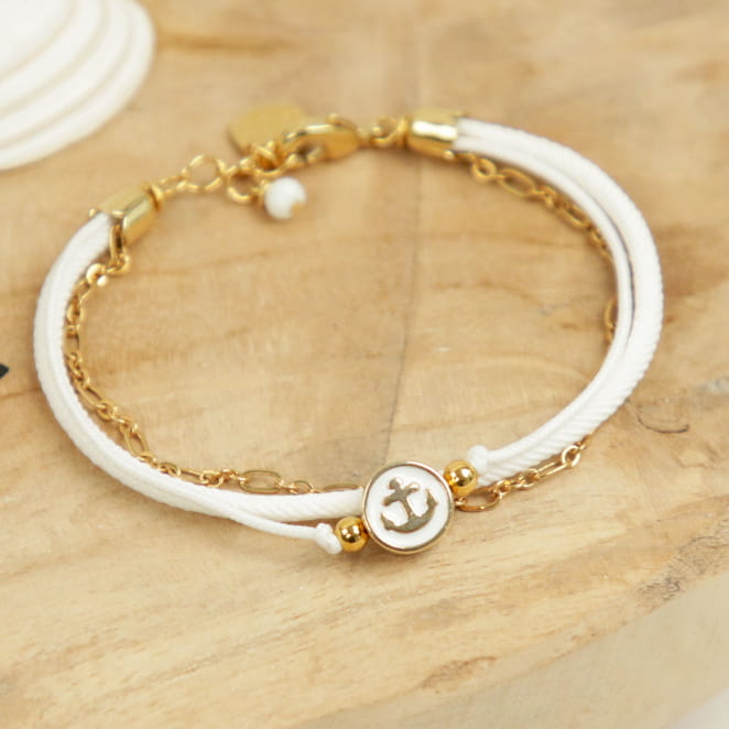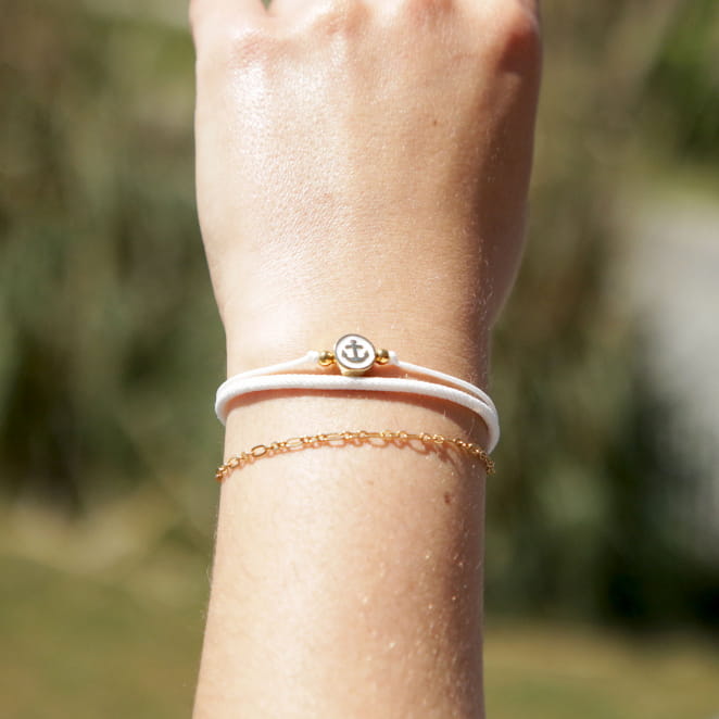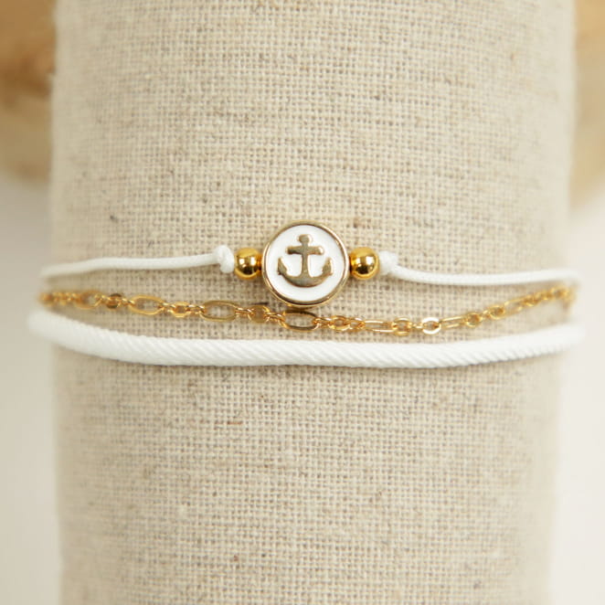 Laissez-vous séduire par le bracelet marin Ferret, un bijou délicat qui capture l'esprit du grand large. Avec son cordon blanc épuré et sa chaîne dorée, il évoque la lumière du soleil sur les vagues et la brise marine des côtes atlantiques. Au centre, une perle émaillée ornée d’une ancre marine apporte une touche raffinée et symbolique, rappelant l’amour de la mer et le goût de l’aventure. Ce bracelet femme, à la fois chic et intemporel, sublimera aussi bien une tenue décontractée qu’un look plus élégant !