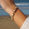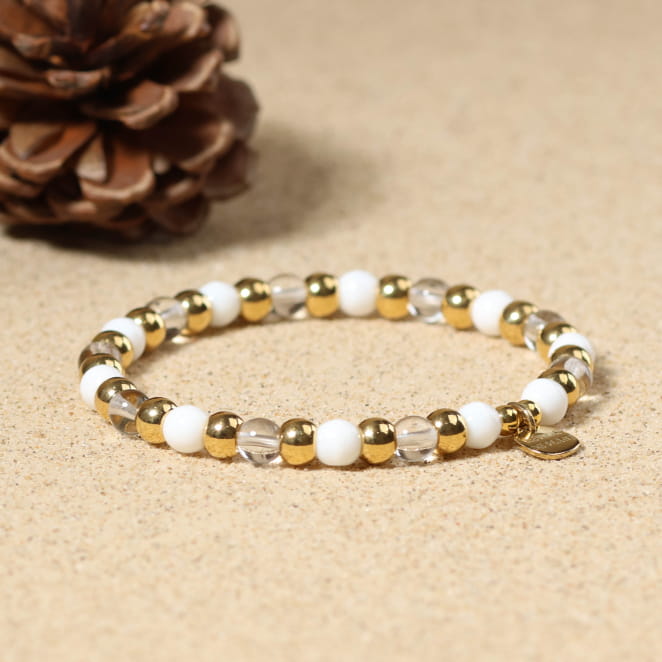 Retrouvez notre bracelet pour femme Fréjus, une création où la pureté des perles en verre transparentes et des perles en verre blanc rencontre l’éclat des perles dorées. Ce bijou capture la lumière et la fait danser à votre poignet, comme un jeu de soleil sur les vagues. Les perles de verre, d’une transparence délicate, apportent une touche lumineuse, tandis que les perles dorées ajoutent une lueur chaleureuse et sophistiquée.