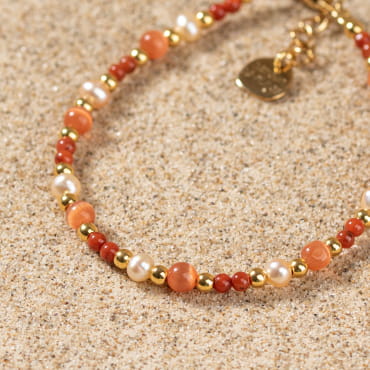 Laissez-vous tenter par ce bracelet frais et plein de poésie, Friendly. Le ruban en soie rouge, doux et léger, s’enroule délicatement autour du poignet, tandis que de petites perles en verre rayé apportent une touche colorée. En son centre, un pendentif doré en forme de coquillage rappelle l’esprit bord de mer. Parfait pour accessoiriser une tenue estivale ou glisser un peu d’océan dans votre quotidien.