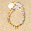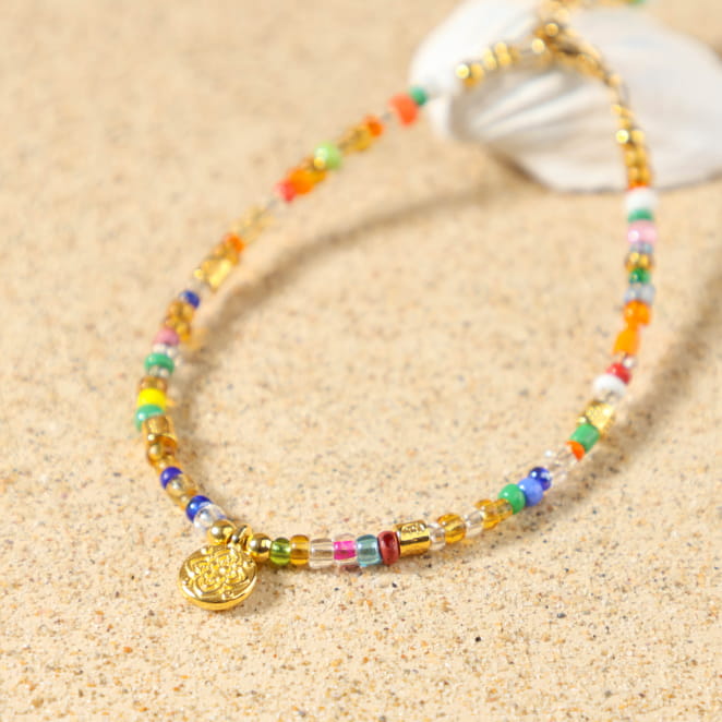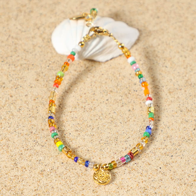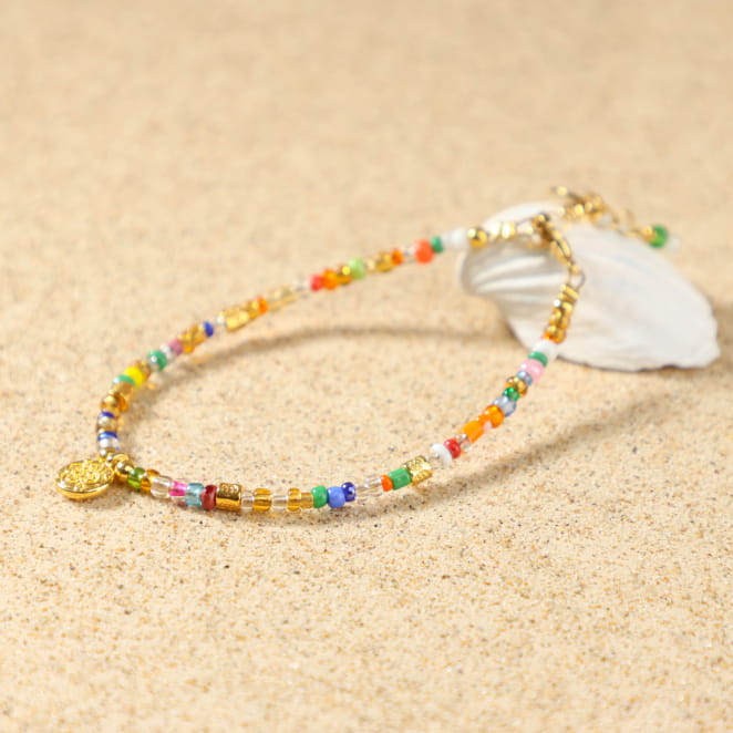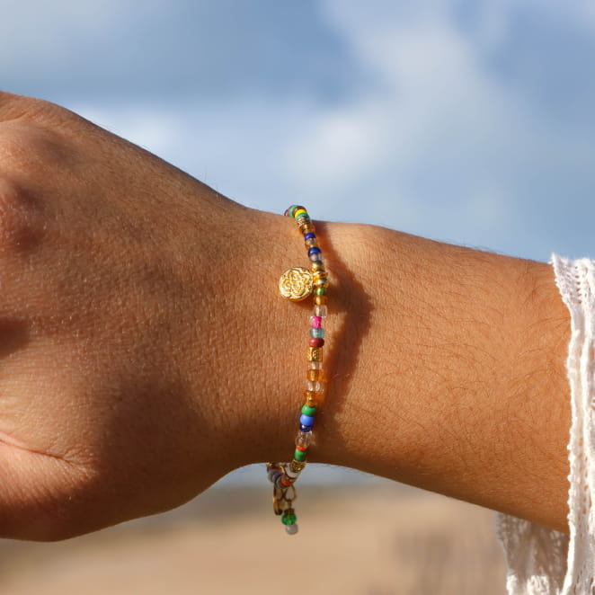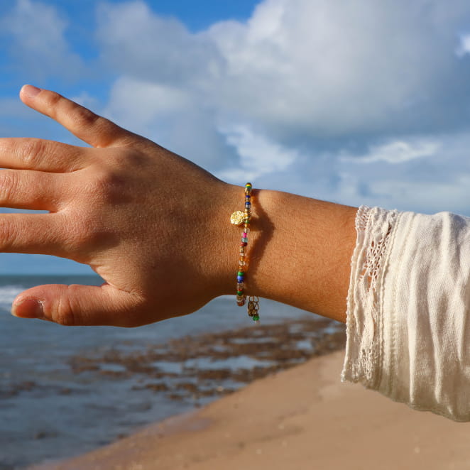 Le bracelet Gazelle met le cap sur la couleur et la bonne humeur ! Léger et plein de peps, il associe des perles en verre aux teintes joyeuses (orange, rose, turquoise, citron…) à un petit pendentif rond doré, placé au centre. Le montage sur câble souple lui donne une allure discrète mais pleine de vitalité. Un bijou simple et solaire, à porter en solo ou en accumulation, pour faire danser le soleil et la joie autour de son poignet !