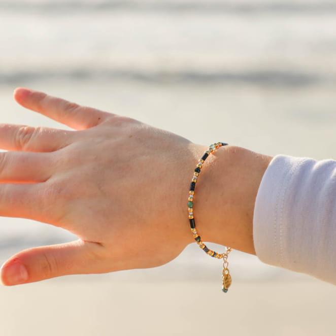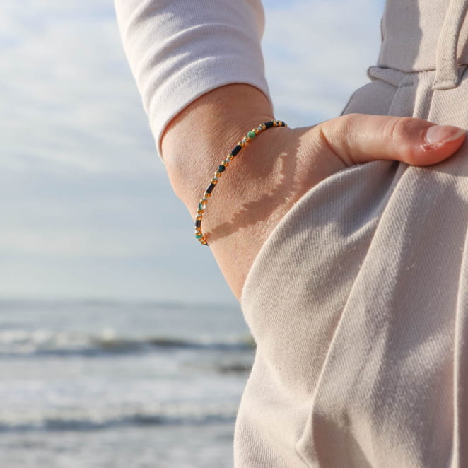 Craquez pour le bracelet Genoise doré, orné de perles aux teintes bleu-gris, évoque les nuances changeantes de l’horizon. Chaque perle est une invitation à l’évasion. Minimaliste et lumineux, il se porte seul pour une touche discrète ou accompagné d’autres bracelets pour un style chic.
