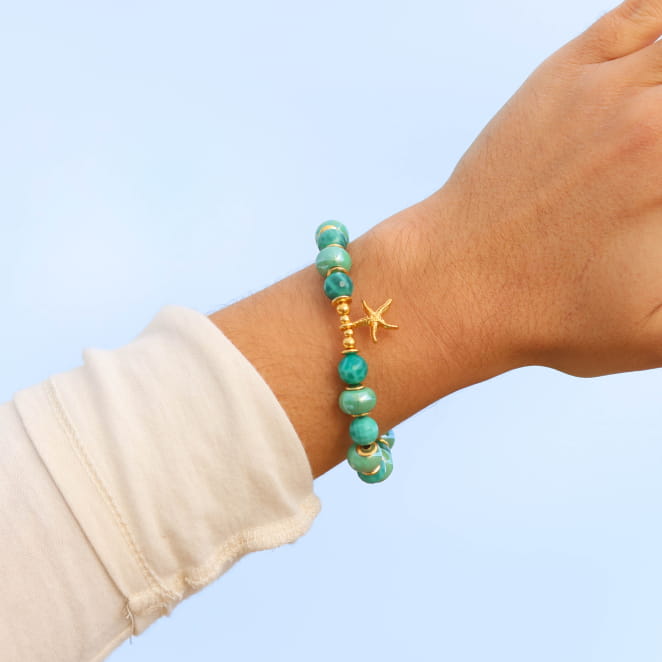 Adoptez au tour de votre poignet le bracelet perle pour femme Gomera. Composé de jolies matières mélant de la céramique avec de la pierre d'agate peafowl vert, ce brillant bijou emeraude se distingue également avec son lumineux pendentif en forme d'étoile de mer. Un accessoire qui apporte une touche marine toute en élégance, rehaussé par le doré ce bijou pour femme est tendance !