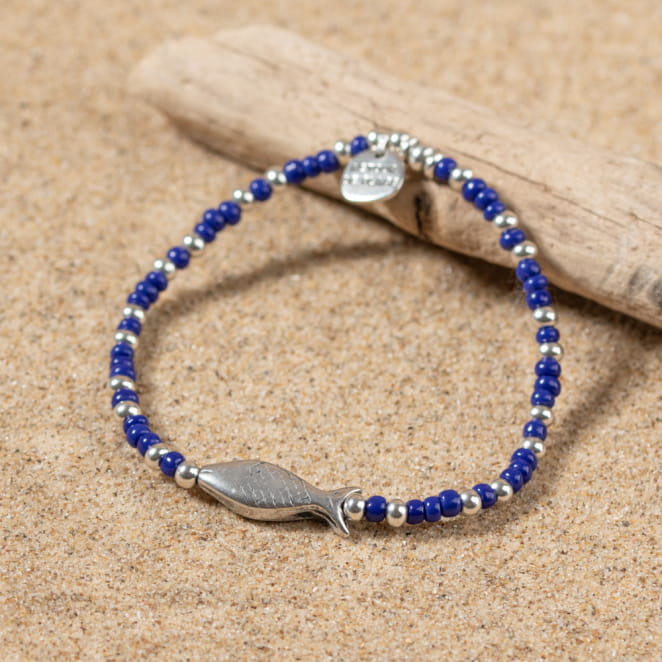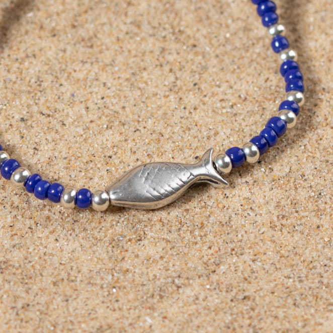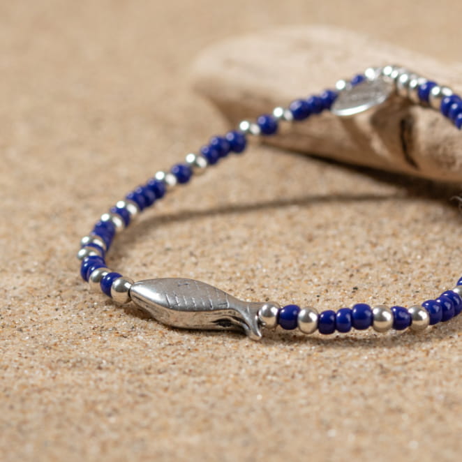 Craquez pour le bracelet marin Goujon, un bijou fantaisie qui séduit par son pendentif poisson en métal argenté. Orné de perles rocailles en verre bleu, il ajoute une touche de couleur et d'éclat à votre tenue. Ce délicat accessoire est parfait pour apporter une note marine et lumineuse à votre style quotidien.