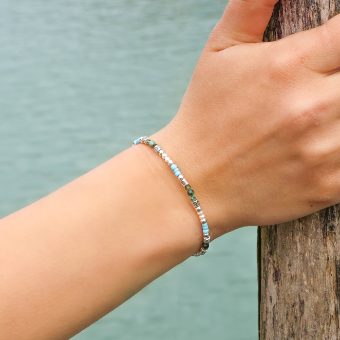 Le bracelet Granita, est un véritable souffle d'air frais, une invitation à l'évasion. Avec ses perles turquoise africaines éclatantes, ses perles de rivière blanches qui rappellent la douceur des vagues et ses touches de perles vertes, il incarne parfaitement l'énergie de la saison à venir. Minimaliste, mais ultra-tendance, il se porte facilement pour ajouter une touche de couleur et de fraîcheur à ton look. Un bijou solaire et inspirant, idéal pour t'accompagner dans tous tes moments de liberté ! 🌊