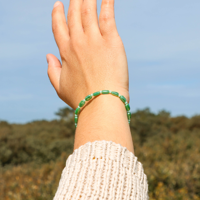 Découvrez ce bracelet pour femme Green, une invitation à l'évasion et à la douceur des bords de mer. Avec ses perles en verre vertes, ce bijou artisanal apporte une touche de lumière et de naturel à votre poignet. Ce bijou coloré rappelle l'authenticité et le savoir-faire français. Parfait pour celles qui aiment les accessoires lumineux et intemporels, ce bracelet s'inspire de l'esprit nature et de la sérénité des vacances au bord de l'eau.