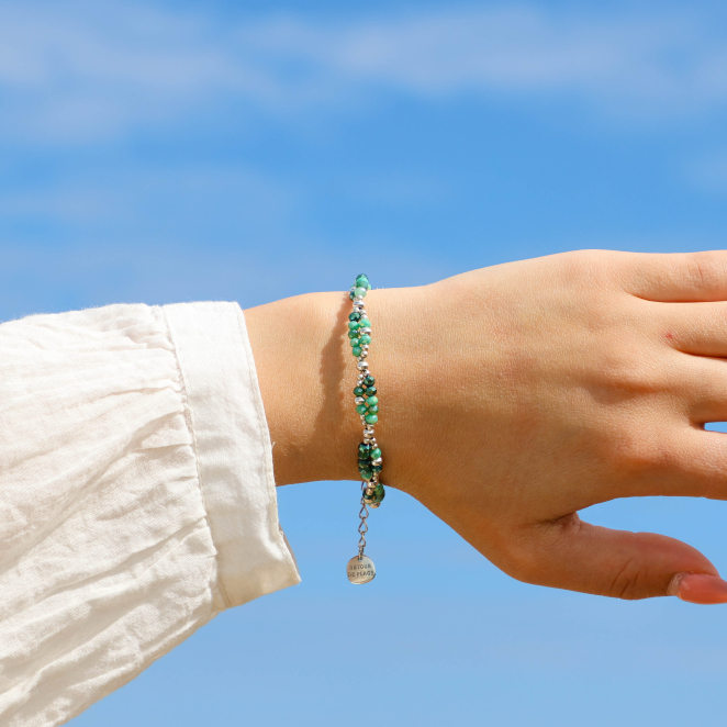 Retrouvez notre bracelet multirang Harmonie vert, une création artisanale aux tons doux et lumineux. Ce bijou, aux perles de verre vert et métal argenté, rappelle le naturel de la côté Ouest. Idéal pour un style naturel et apaisant.