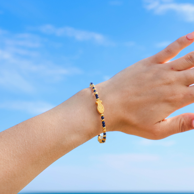 Optez pour le bracelet Heolyn, une explosion de couleurs bleu marine et doré qui rappelle les reflets du bord de mer. Ses perles en verre bleu et ses pendentifs poisson en émaille apportent une touche lumineuse et joyeuse à votre style.