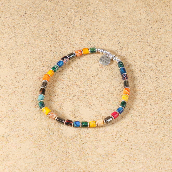 Apportez une touche de couleur et d’originalité à votre style avec Amazonie, notre bracelet pour homme en perles naturelles. Ce bijou unique associe élégamment l'éclat argenté de l’hématite à la richesse naturelle du jaspe, dans un design multicolore inspiré des teintes vibrantes de la forêt tropicale.