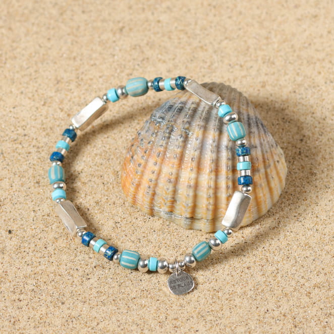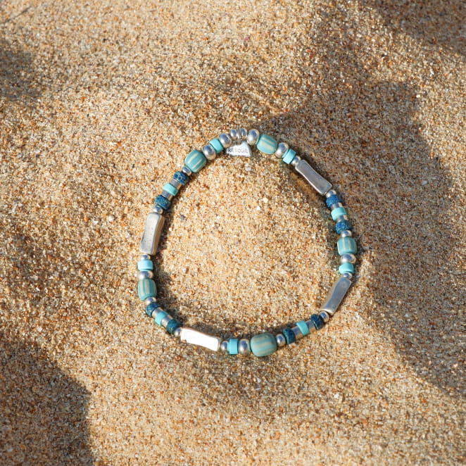 Affirmez votre style avec naturel et élégance grâce au bracelet Anatol. Monté sur un fil élastique solide, il associe des perles en métal plaqué argent 999, des perles en pierre naturelle et des perles en verre aux nuances bleutées. Son mélange de textures et de reflets lui confère un caractère brut et élégant, idéal pour un look décontracté et affirmé. Ce bracelet évoque les nuances de l’océan et la lumière des rivages. Facile à enfiler, il s’adapte parfaitement au poignet et peut se porter seul ou accompagné d’autres bracelets pour un effet accumulation.