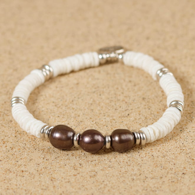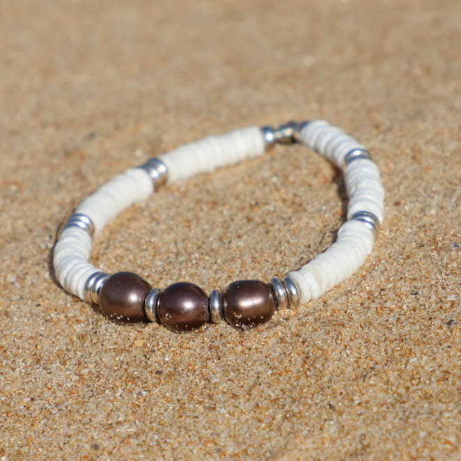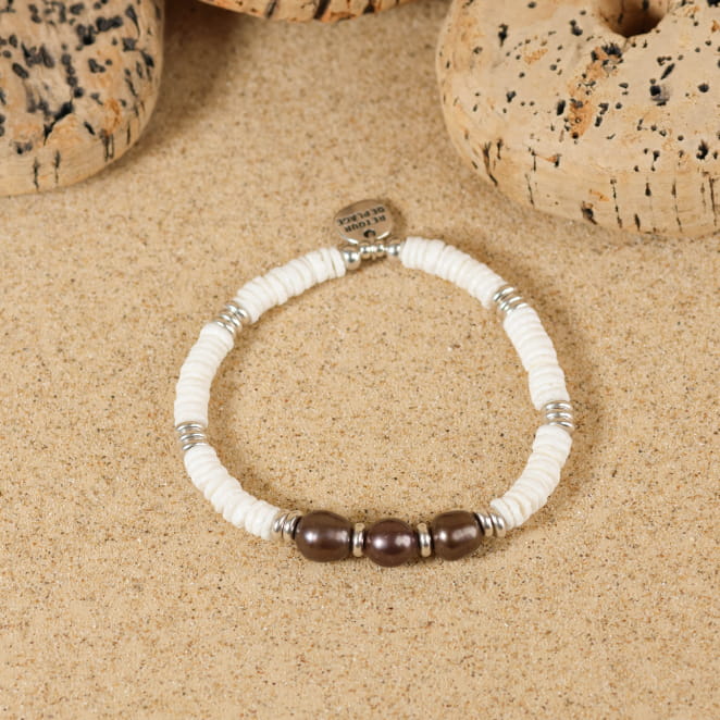 Inspiré des rivages et des trésors qu’on y déniche, le bracelet Barnabé combine l’aspect brut du coquillage poli et la rondeur élégante des perles de rivière. Monté sur un fil élastique solide, il s’enfile facilement pour accompagner toutes vos aventures. Un bijou masculin aux allures naturelles et intemporelles !