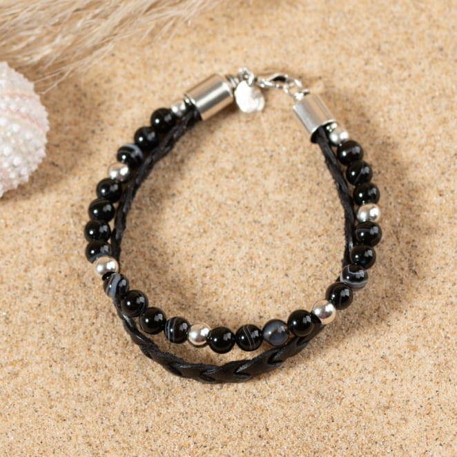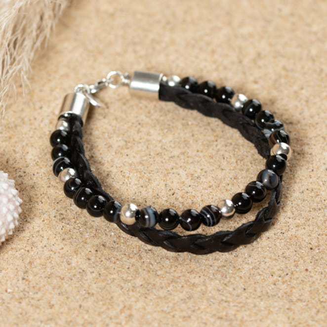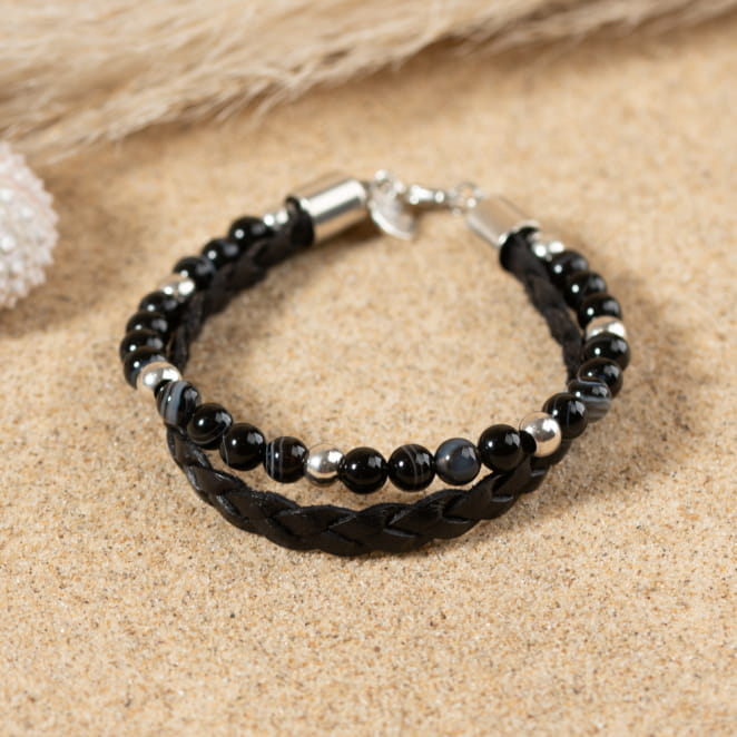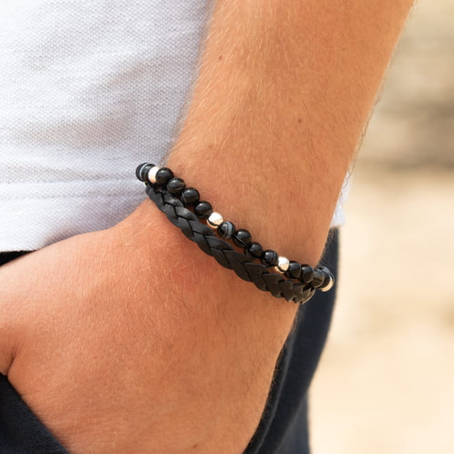 Le bracelet Dixon, viril et masculin, marie une tresse en cuir à de magnifiques perles en agate aux tons sombres et argentés. Une fusion de robustesse et d'élégance pour compléter le style de l'homme moderne avec force et raffinement.
