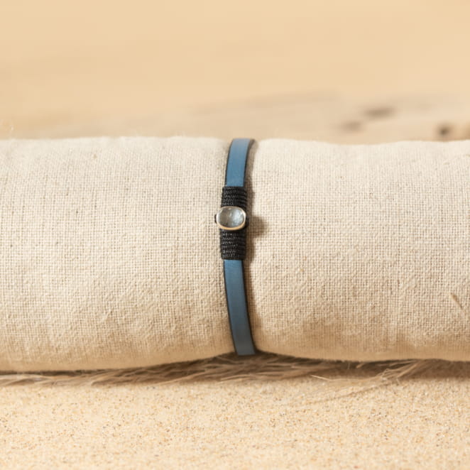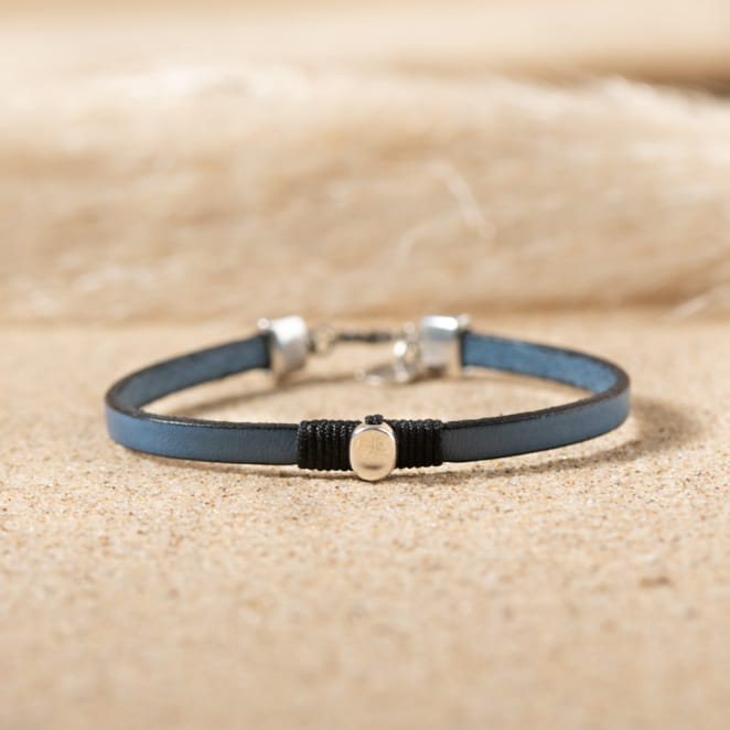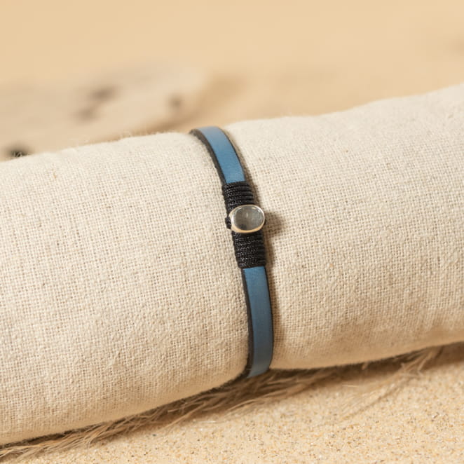 Découvrez le bracelet Djoudi, un bijou masculin élégant. Ce bracelet, avec son ruban en cuir bleu, se distingue par sa pastille ovale en métal argenté, subtilement attachée par un fil noir. Avec ses couleurs sobres, il s'adapte à tous les styles, offrant un look viril et lumineux.
