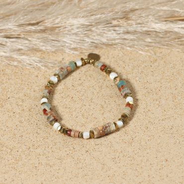 Adoptez le bracelet Isolde, un accessoire élastique aux teintes marron et bronze, alliant force et élégance discrète. Un bijou unique harmoniant du doré et de l'hématite gris avec du jaspe marron, inspiré par les éléments naturels. Parfait pour les hommes en quête d’authenticité et de style intemporel.