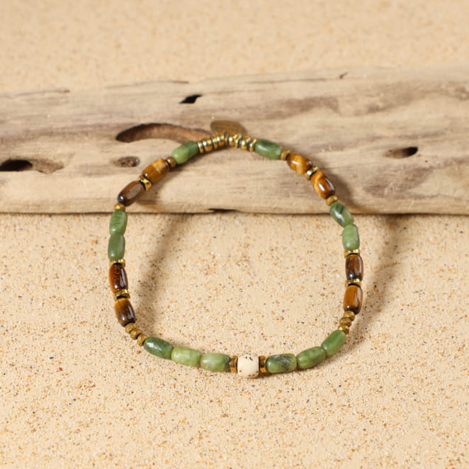 Découvrez le bracelet Mangrove, une création artisanale aux couleurs kaki et bronze, idéale pour apporter une touche d’évasion et de naturel à votre style. Ce bracelet homme, inspiré par les paysages sauvages et les teintes chaudes du bord de mer, allie harmonieusement des perles en métal bronze, des perles de graine de lotus beige, des perles en pierre d’œil de tigre marron, des perles de jadeite vert et des perles en hématite doré. Son anneau ovale en métal bronze ajoute une touche d’élégance discrète. Parfait pour ceux qui aiment les accessoires uniques et lumineux, ce bracelet s’adapte à tous les poignets grâce à son élasticité.