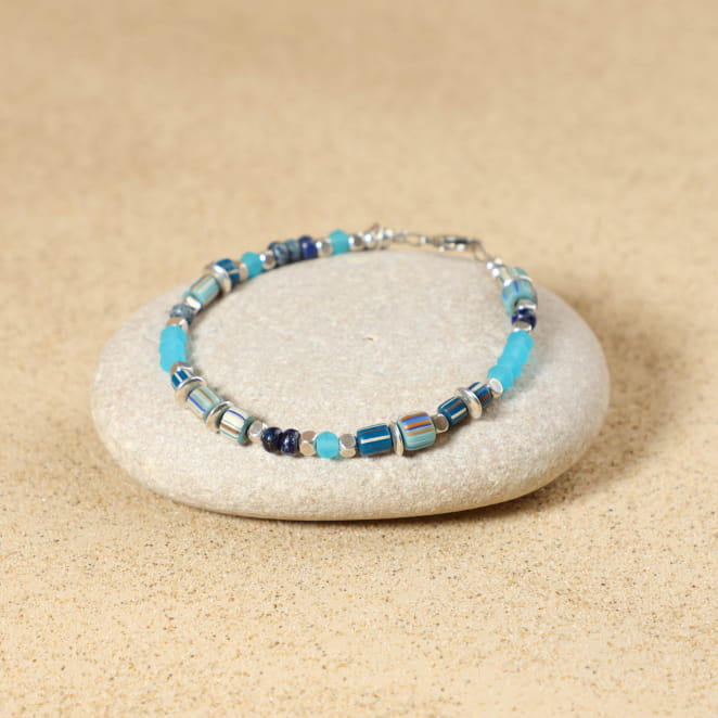 Soulignez votre personnalité avec notre bracelet homme en perles Match, une création artisanale unique. Ce bijou, inspiré par le bord de mer, met en valeur votre poignet en combinant des matériaux naturels : rocaille de verre bleu et jaspe impérial bleu. Les détails des nuances de couleurs, des matériaux et des formes variées ajoute une touche d'originalité et de modernité à votre style !