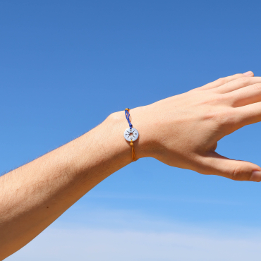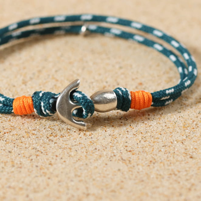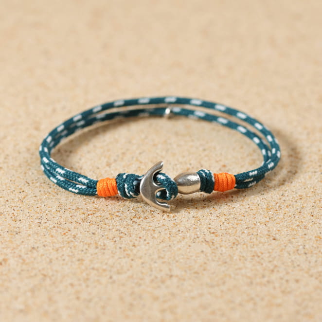 Laissez-vous porter par l’esprit marin avec ce bracelet pour homme Peppo, un mélange harmonieux de couleurs. Ce bracelet pour homme, alliant un cordon en éco-nylon vert et un cordon en nylon orange, se ferme facilement avec son attache argentée en forme d’ancre. Un bijou artisanal bleu océan fait main, pour ceux qui aiment les accessoires de caractère.