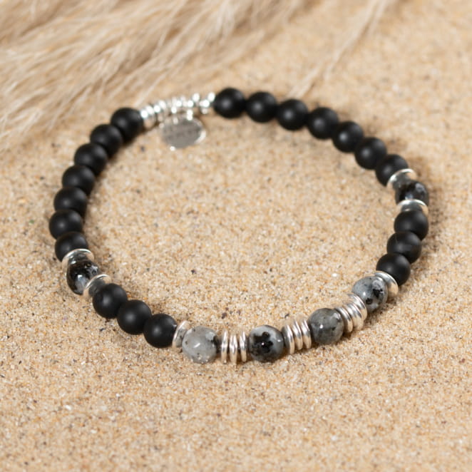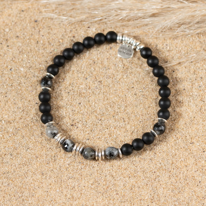Affirmez votre style avec le bracelet pour homme Sparrow. Inspiré des pirates, il est orné de perles de labradorite et d'agate noir, rehaussées de perles en métal argenté. Ce bijou unique vous transporte dans l'aventure avec élégance et caractère, ajoutant une touche audacieuse à votre look.
