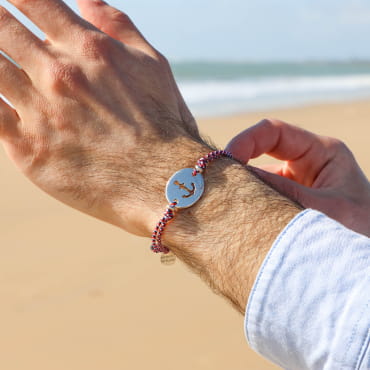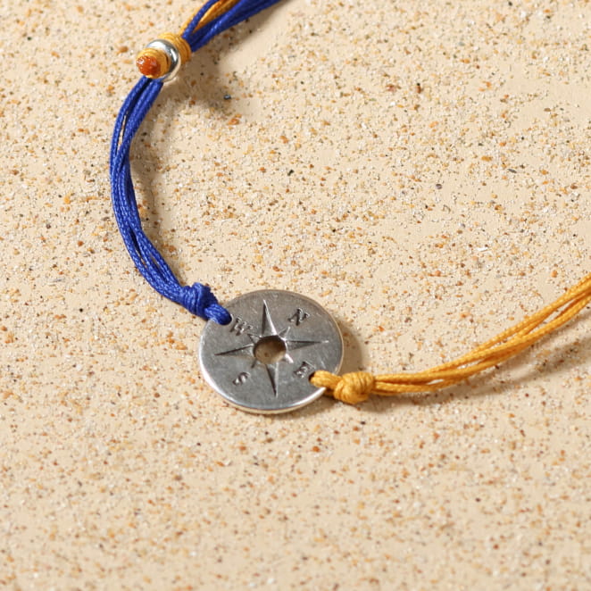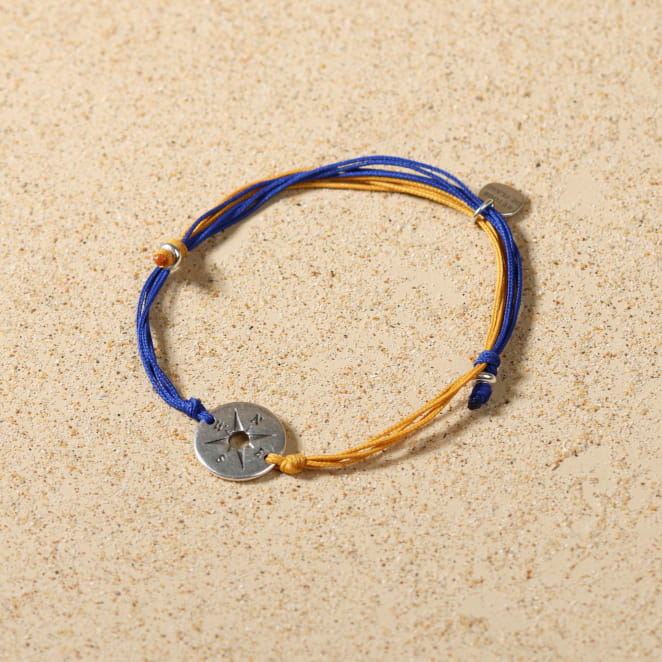 Optez pour notre bracelet coulissant pour homme Wind, une pièce unique et fabriquée à la main qui évoque l’esprit du bord de mer. Ce bracelet pour homme, conçu avec des cordons en fil polyester recyclé bleu et jaune, est agrémenté d’un pendentif rond en forme de rose des vents. Un bijou artisanal, original et résolument inspiré par les paysages marins, pour un style à la fois authentique et intemporel.