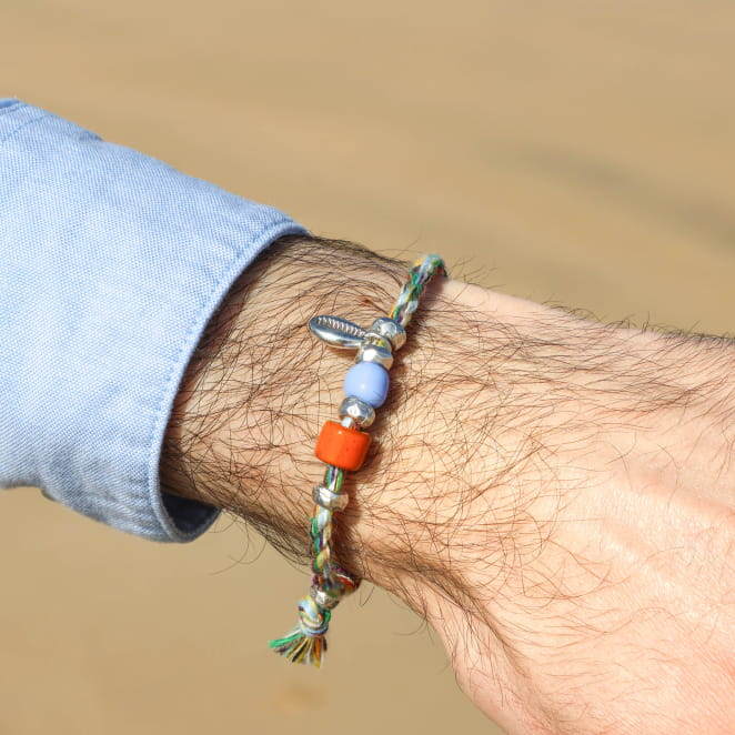 Retrouvez notre bracelet pour homme Yannick incarne l’esprit marin. Son cordon en coton coloré lui ajoute un caractère authentique et artisanal. Ses perles argentées apportent une touche de brillance discrète, tandis que ses perles en terre cuite et en verre ajoutent une touche de couleur et de lumière ! Le pendentif argenté en forme de coquillage, symbole de l’océan, apporte un équilibre subtil entre force et originalité. Ce bracelet homme s'adapte facilement à votre poignet grâce à son noeud coulissant, parfait pour accompagner toutes les aventures du quotidien.